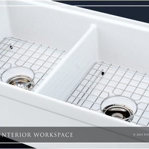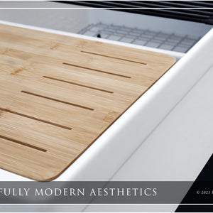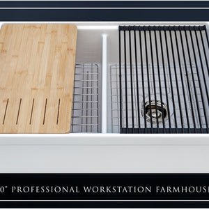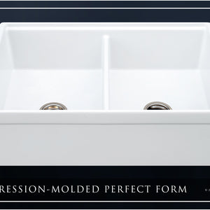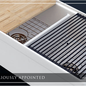 Luxury 33" x 20" compression-molded SOLID fireclay workstation apron-front kitchen sink. 50/50 double bowl, modern design with 1/2" radius interior corners, straight sidewalls, belted front apron, 1" material thickness, and glossy glaze. Topside accessories include a roll-out drying mat and slotted bamboo cutting board. Elegant polished nickel "linear" (pattern), basket strainer-drain, and disposal flange basin accessories finish out the package.