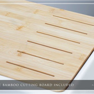 Included with this sink are five accessories: One (1) Bamboo cutting board, one (1) silicone dish drying rack, two (2) custom-fitted sink grids, one (1) basket strainer drain, and one (1) garbage-disposal flange.
